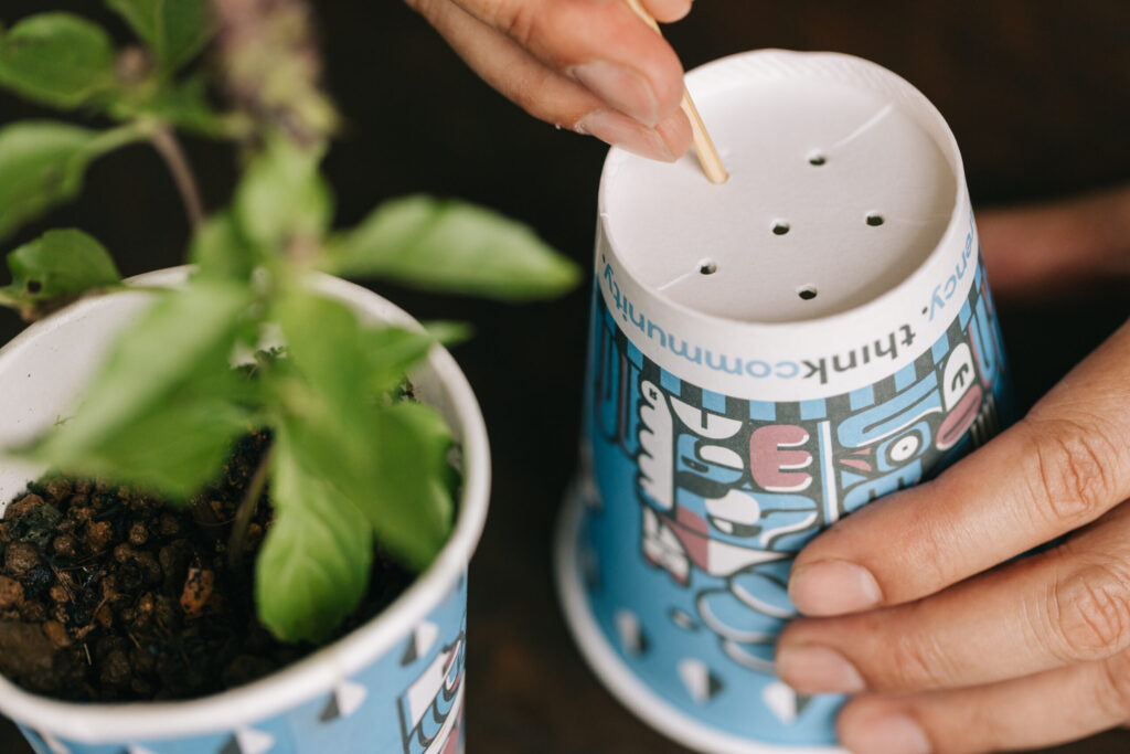 育苗ポット、なければ紙コップの底に穴を開けて、1:3で堆肥とブレンドした赤玉土を入れ、そこに種をまくだけ。