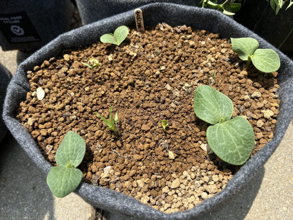 最近、畑やプランターからトマトやカボチャの芽が顔を出してきました。