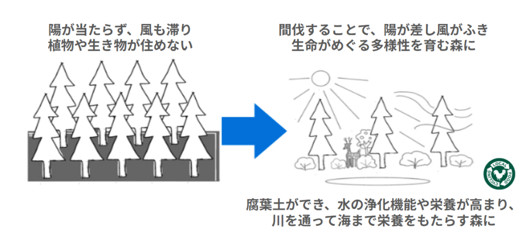 間伐することで、森の中には光や風が行き渡り、多様な生き物が共存できる健やかな里山の再生につながります。